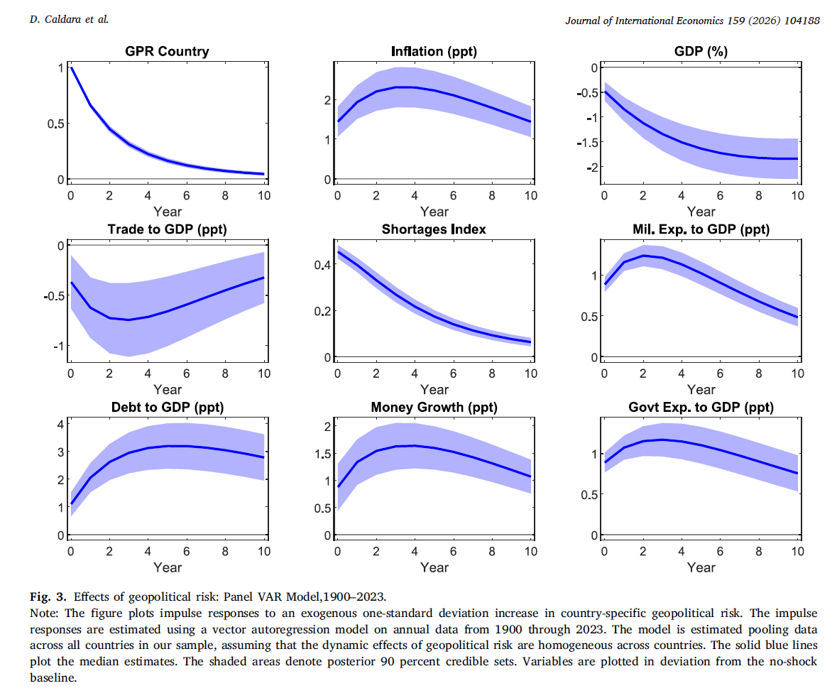 Today, I will start a series of blog to replicate the Figures of recent research on the macroeconomic effects of geopolitical risk. In “Do geopolitical risks raise or lower inflation?,” Caldara, Conlisk, Iacoviello, and Penn (CCIP, hereafter) ask a very important question. The Figure 3 in CCIP shows that after an adverse country-specific geopolitical risk shock, inflation rises, GDP falls, trade contracts, shortages increase, military spending rises, debt rises, money growth rises, and government spending increases. In other words, geopolitical risk looks inflationary and contractionary at the same time. That is precisely what makes the figure so interesting for macroeconomists. The paper estimates these responses in a pooled panel VAR on annual data from 1900 through 2023 and reports posterior median impulse responses together with 90 percent credible sets.