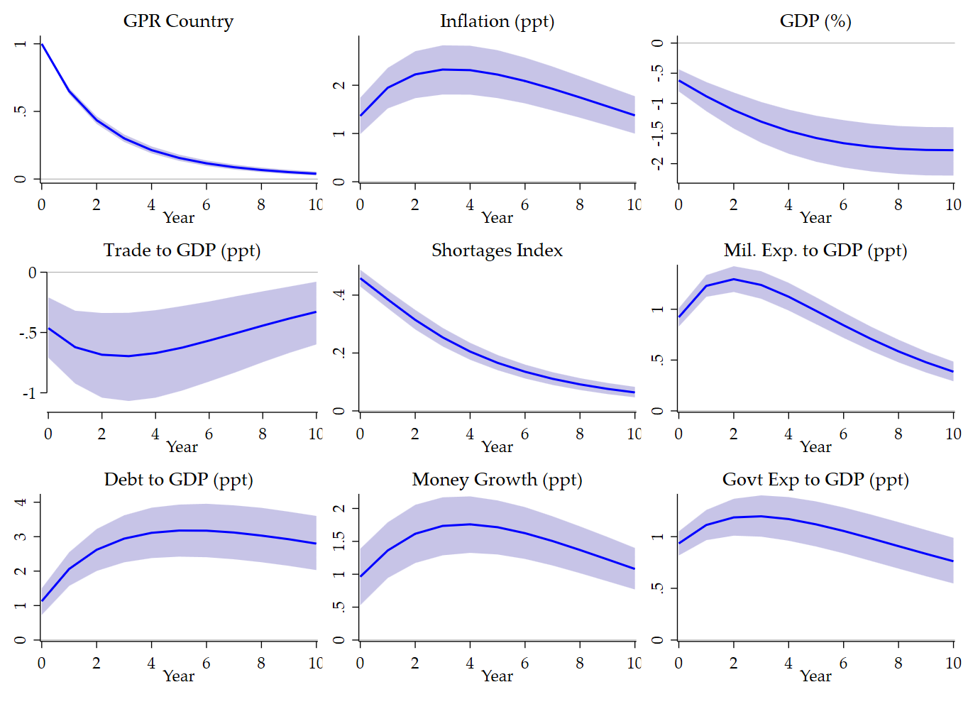 The final replication matches the published figure well in the dimensions that matter most. Country GPR declines monotonically after the shock. Inflation follows a hump-shaped response. GDP declines persistently. Trade falls and only partially recovers. Shortages fade gradually from an elevated level. Military expenditures, debt, money growth, and government spending all increase after the shock. These are the core dynamic patterns in the published figure, and they all emerge clearly in the replication. In the following, I include, first, Figure 3 in the paper and, then, my replication using Stata/Mata abilities: