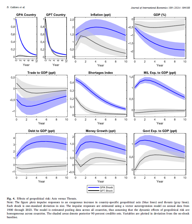 This follow-up turns to Figure 4, which is even more informative from an economic point of view. Instead of treating geopolitical risk as a single object, the paper decomposes it into 2 components: geopolitical acts and geopolitical threats. The question is simple but important. Do realized adverse events and anticipatory geopolitical tensions transmit differently to inflation, output, trade, shortages, and policy variables? The answer in the paper is yes: both shocks are inflationary and contractionary, but acts are generally larger and more persistent. The figure is estimated on annual data from 1900 through 2023 in the same pooled panel VAR spirit as the baseline analysis.