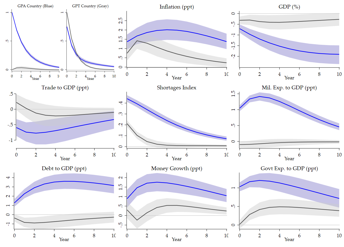 In both versions, geopolitical acts produce a stronger inflation response than geopolitical threats. The blue inflation response is hump-shaped and remains clearly above the gray one over the full horizon. GDP falls after both shocks, but the decline associated with acts is markedly larger. Trade contracts more after acts, shortages remain elevated after both shocks but are clearly stronger for acts, and military spending, debt, money growth, and government expenditure all display a larger response to acts than to threats.