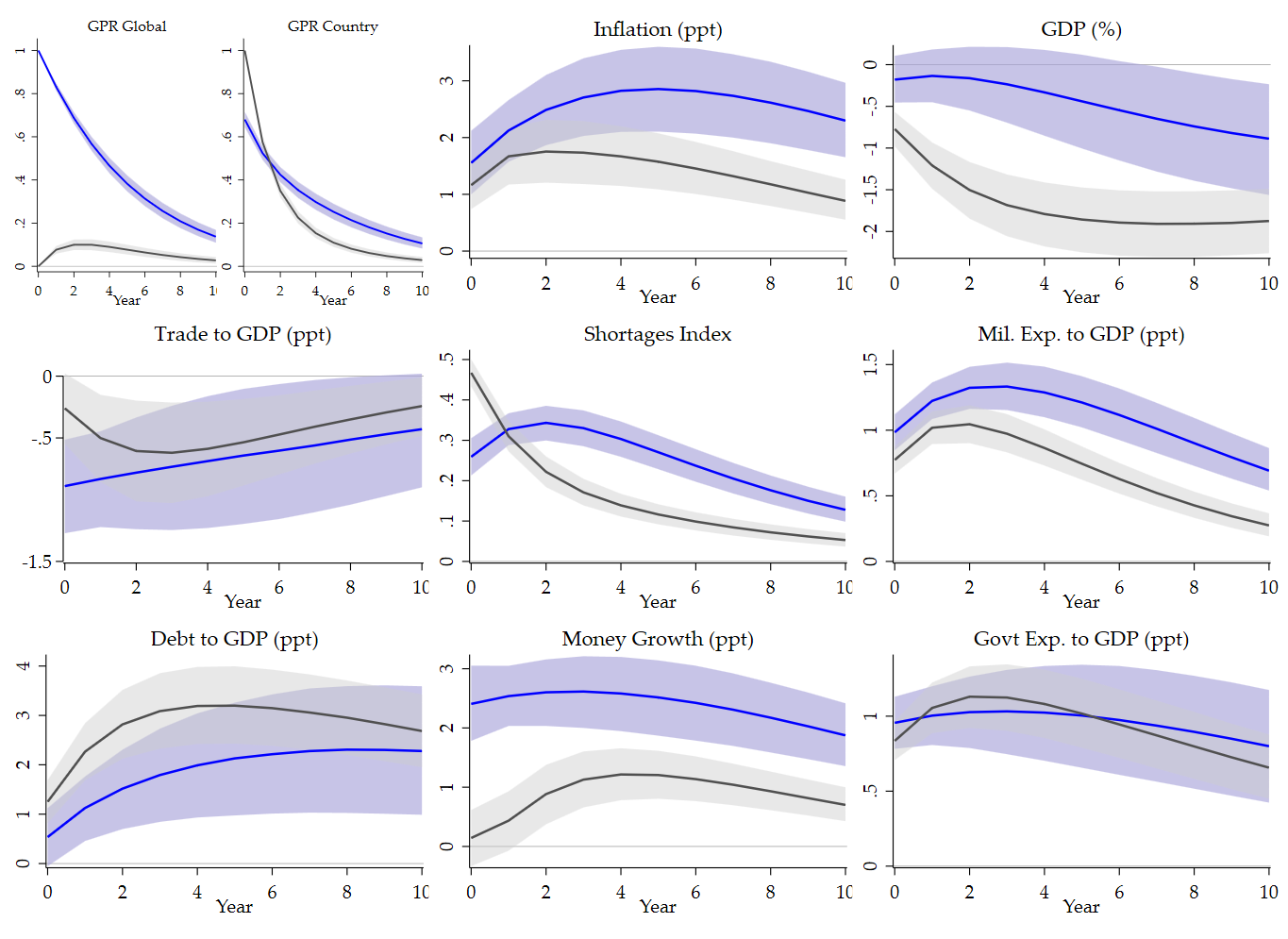 In Figures 3 and 4, the objects of interest are country-varying series, so the within-country transformation is relatively straightforward. Figure 5 is more subtle because it combines a global GPR index with a country-specific GPR index. That creates an additional normalization problem in the plotted impulse responses, especially for the blue curves associated with the global shock.