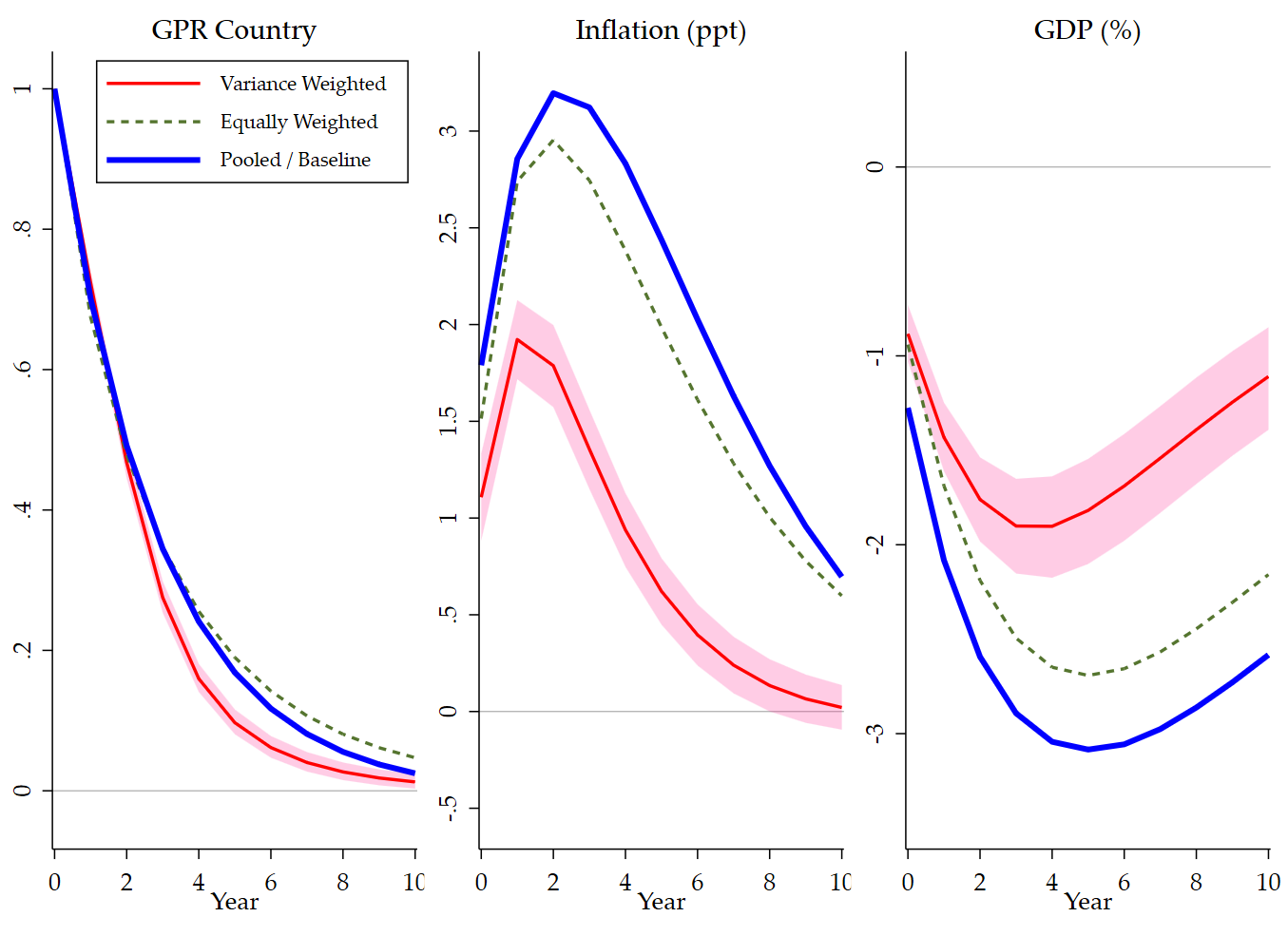 The third panel shows that GDP falls after the shock under all 3 estimators. Once again, the pooled and equally weighted estimates are quite close, while the inverse-variance weighted response is somewhat less negative. But the sign is consistent throughout. This matters a great deal for interpretation. If geopolitical risk were mainly operating through demand compression, one might expect inflation to fall together with output, or at least to display weaker inflationary effects. Instead, the joint pattern of higher inflation and lower GDP is much more consistent with a supply-side disturbance, or at least with a shock in which supply effects dominate.