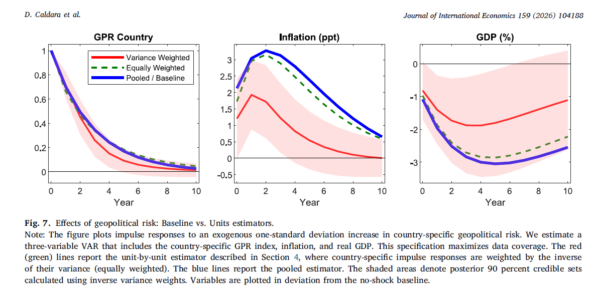 This is especially important in a long historical sample mixing advanced and emerging economies, wartime and peacetime episodes, and very different institutional settings. One could easily have imagined a much less stable pattern. Instead, the figure suggests that the result is surprisingly general: geopolitical risk tends to raise inflation and reduce output, even once we stop imposing common dynamics mechanically.