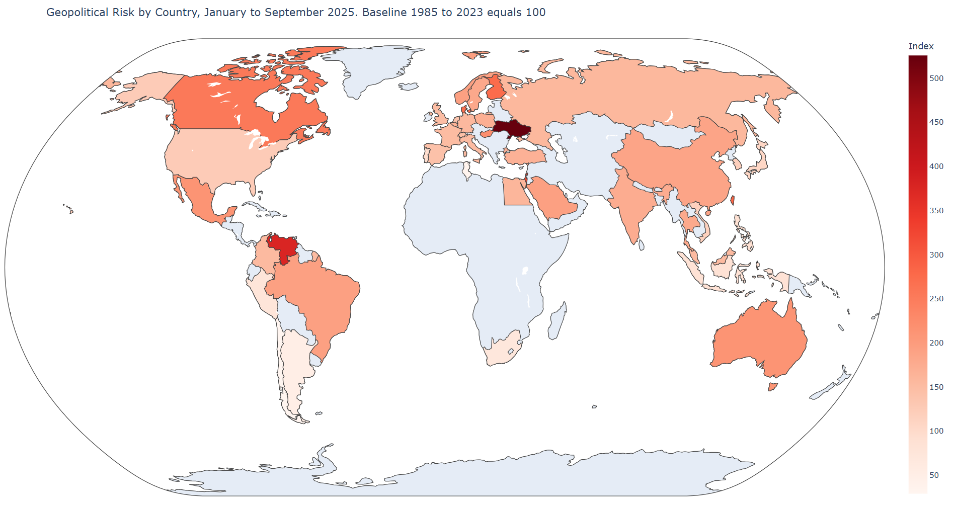 title="Geopolitical Risk by Country, January to September 2025. Baseline 1985 to 2023 equals 100"