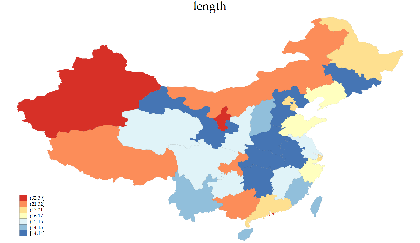 The province map displays very clear spatial clustering. Western provinces such as Xinjiang and Tibet show the longest names. Coastal provinces such as Zhejiang, Fujian, and Guangdong show shorter averages. This pattern reflects linguistic and historical differences. Regions with strong minority presence or long descriptive toponyms naturally produce longer administrative names. Regions with older and more standardized naming traditions display more concise labels.