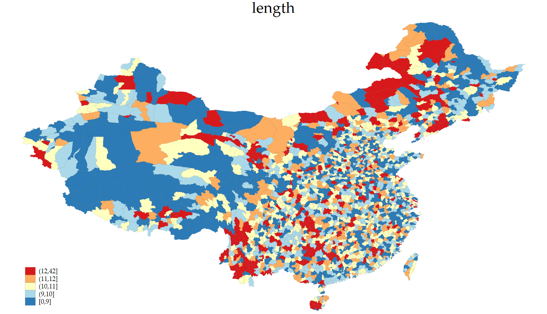 grmap length using CHN_ADM2_shp, id(_ID) fcolor(BuYlRd) ///