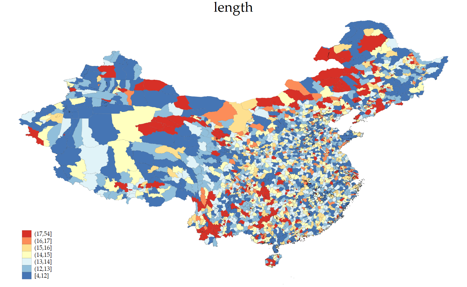 The county-level map is the most detailed and the most striking. At this resolution China appears as a mosaic. Clusters of long names and clusters of short names appear even within the same prefecture. The highest values are observed in parts of the southwest and along certain historical frontier regions. The provincial capitals and major prefectures appear as small pockets with short names, consistent with urban administrative simplification.