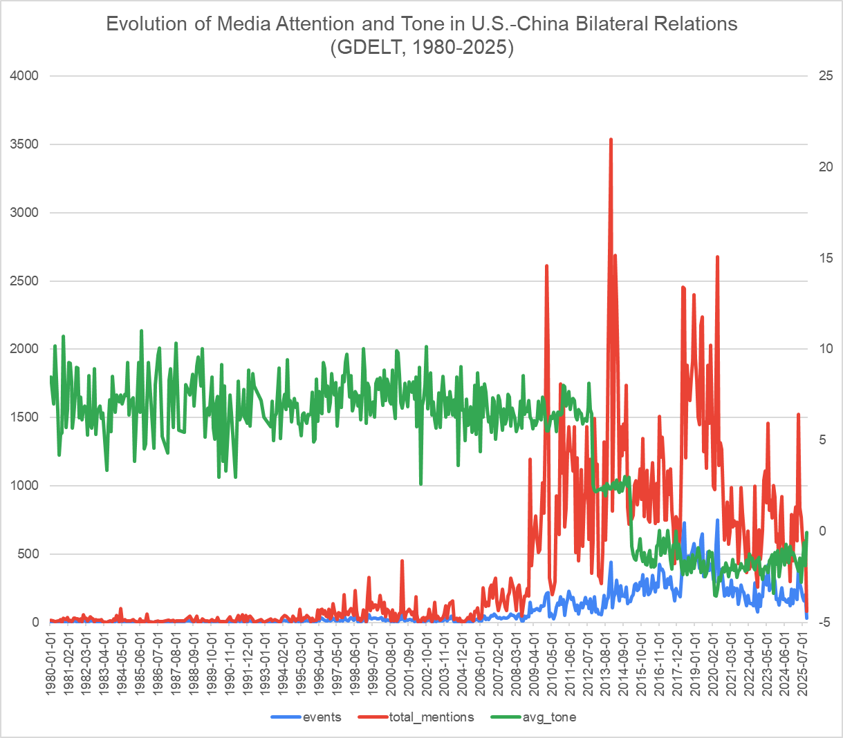 Evolution of Media Attention and Tone in U.S.-China Bilateral Relations (GDELT, 1980-2025)