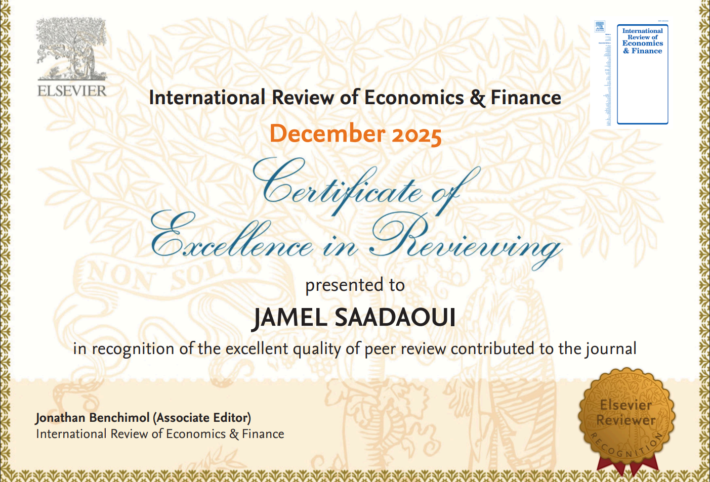 Very happy to share that I received Excellence Award Certificate from the International Review of Economics and Finance. I thank Jonathan Benchimol for this.