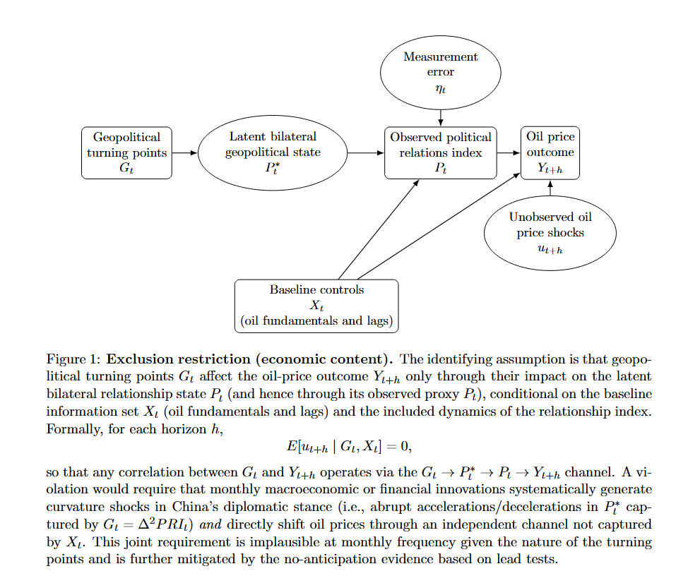 Putting these layers together, exclusion becomes a transparent maintained condition: once we condition on oil fundamentals and the rich dynamics of relations, it is implausible that monthly macro/financial innovations are driving abrupt inflections in China’s diplomatic stance toward its main partner.
