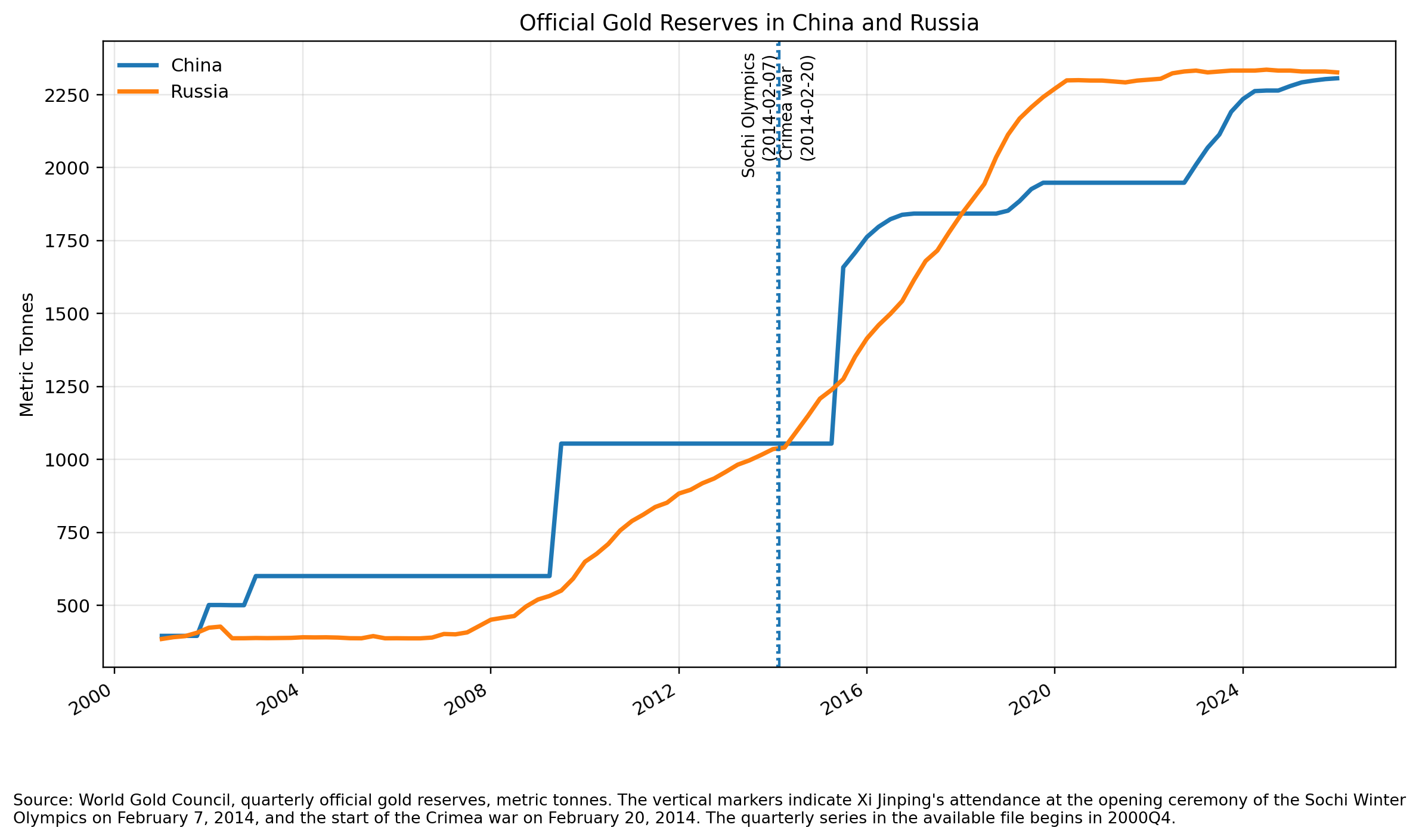 Against that backdrop, the steady accumulation of official gold by both Moscow and Beijing can be read as part of a wider effort to reduce exposure to a Western-centered financial order. Gold is not only a reserve asset; it is also a strategic hedge against sanctions risk, currency dependence, and geopolitical fragmentation. This does not prove a formal alliance, but it is consistent with a progressively stronger alignment between Russia and China that was already observable during the Crimea episode, which can reasonably be described as the first war in Ukraine. The official quarterly gold-reserve series tracked by the World Gold Council provides the empirical backdrop for this interpretation.