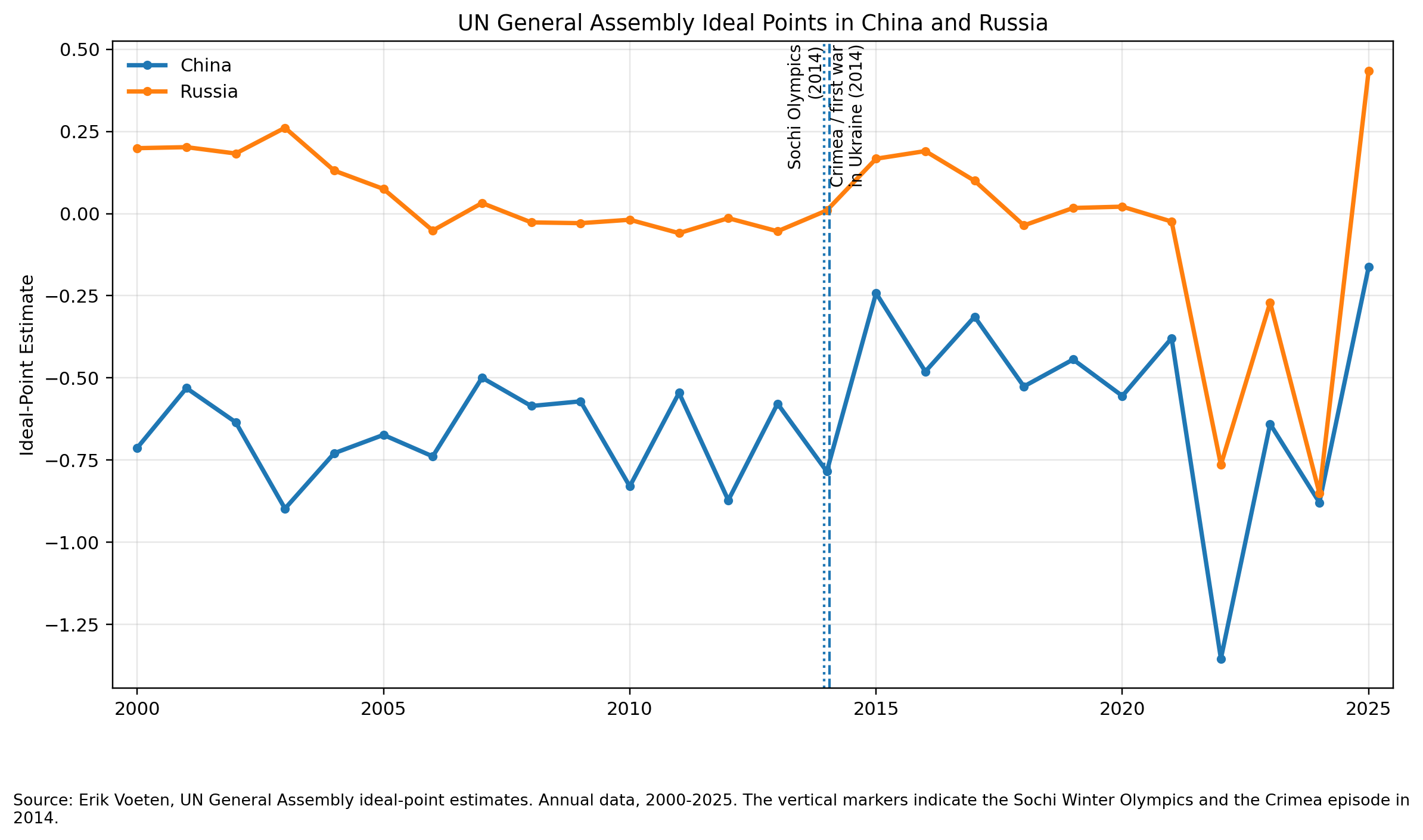 The ideal-point evidence complements the gold-reserve story. While reserve accumulation captures a strategic monetary response to a more fragmented international environment, Erik Voeten’s UN General Assembly ideal-point estimates provide a separate measure of countries’ diplomatic positioning. Read together, the 2 figures suggest that the rapprochement between China and Russia was not only visible in reserve management but also in the broader pattern of international alignment. This is especially interesting around 2014, the year of the Sochi Olympics and the Crimea episode, which marked the beginning of the Russia-Ukraine war in February 2014.