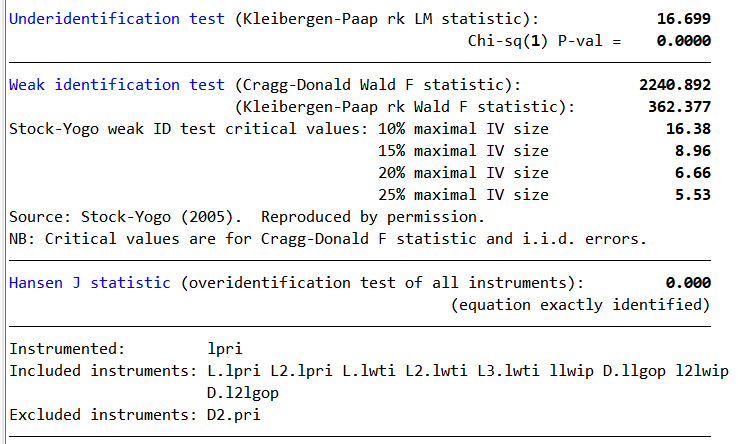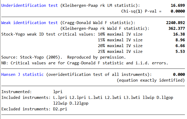 The instrument is the geopolitical turning points. It capture the sudden changes in the geopolitical dynamics that are not anticipated by the markets and economic agents. The test for the instrumental variable is the first stage diagnostic that you have runing the following in IV regressions with Stata. First, we take a look at what is produce by the locproj command: