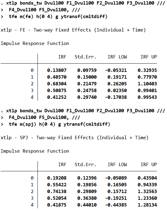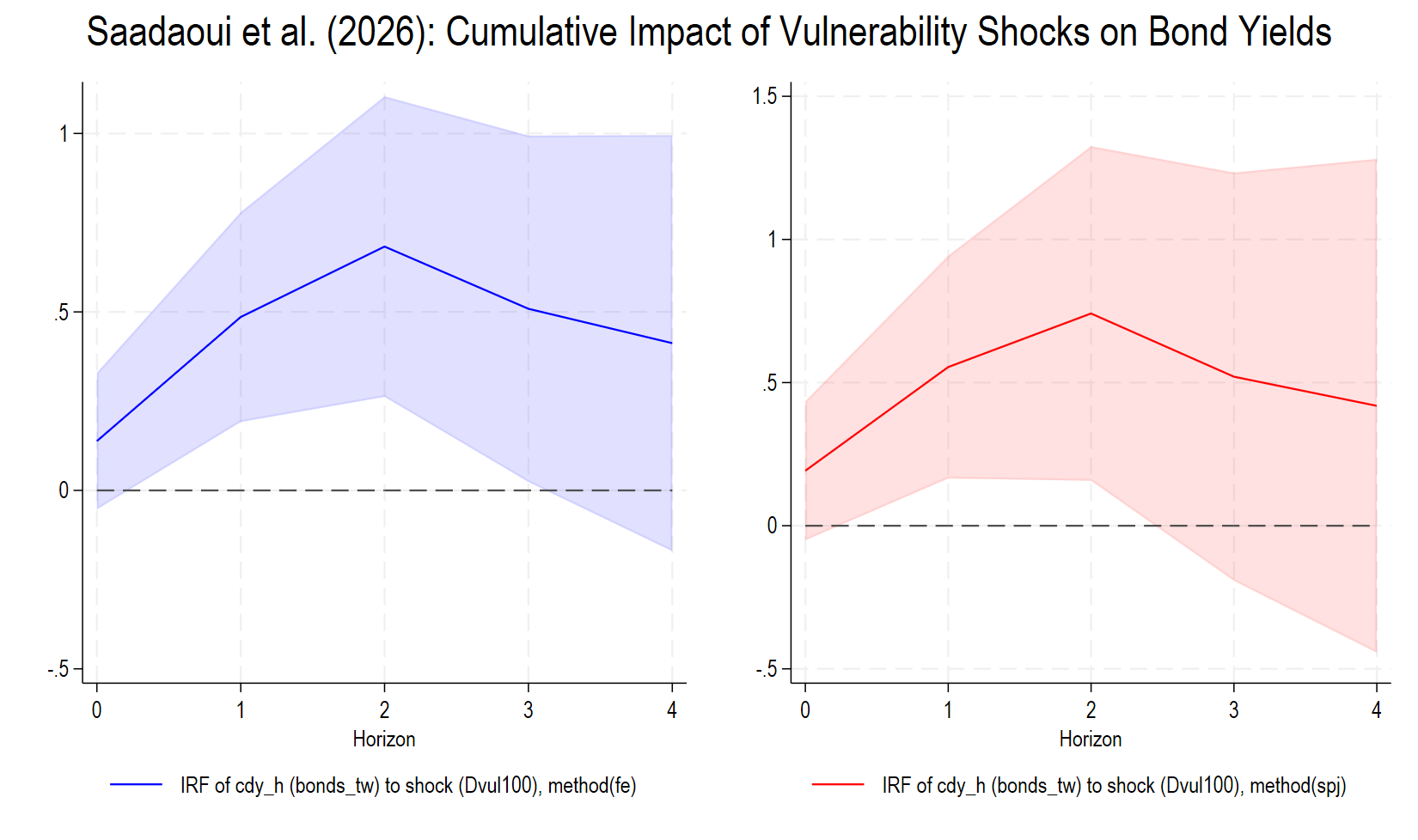 graph combine IRF_fe IRF_spj, name(Figure1, replace) title("Saadaoui et al. (2026): Cumulative Impact of Vulnerability Shocks on Bond Yields")