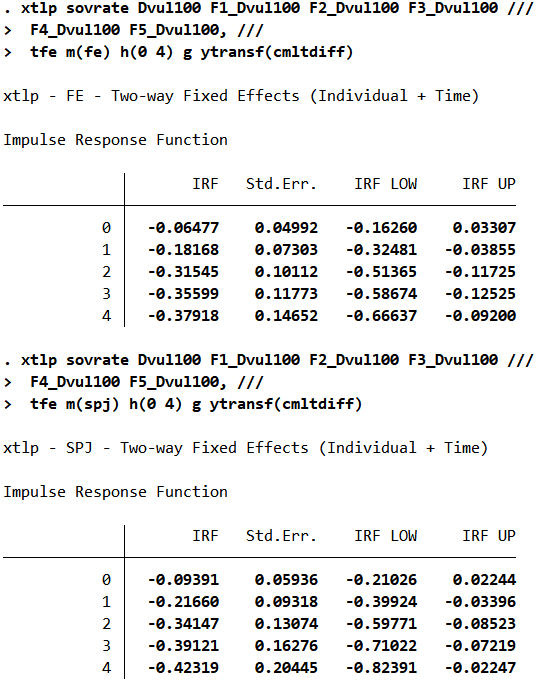Regarding my own recent works, a natural application of this correction is my recent work on the fiscal consequences of climate vulnerability. I made a series of blogs about it. The latest version of the working paper is available here. What happens to the results in Figures 6 and 8 in the paper when I apply the split-panel jackknife (SPJ) correction.