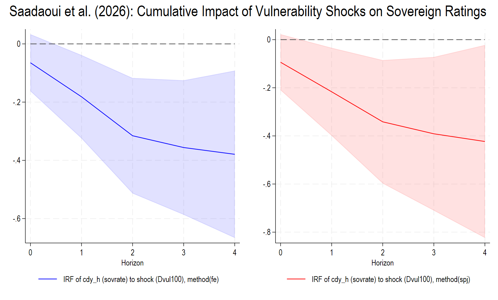 graph combine IRF_fe IRF_spj, name(Figure2, replace) title("Saadaoui et al. (2026): Cumulative Impact of Vulnerability Shocks on Sovereign Ratings")