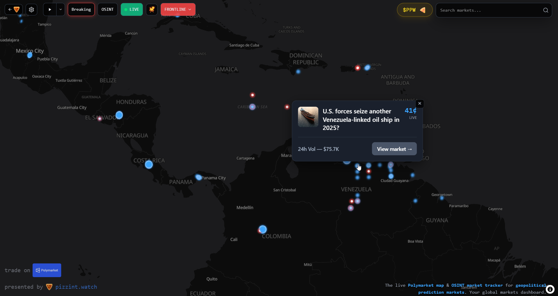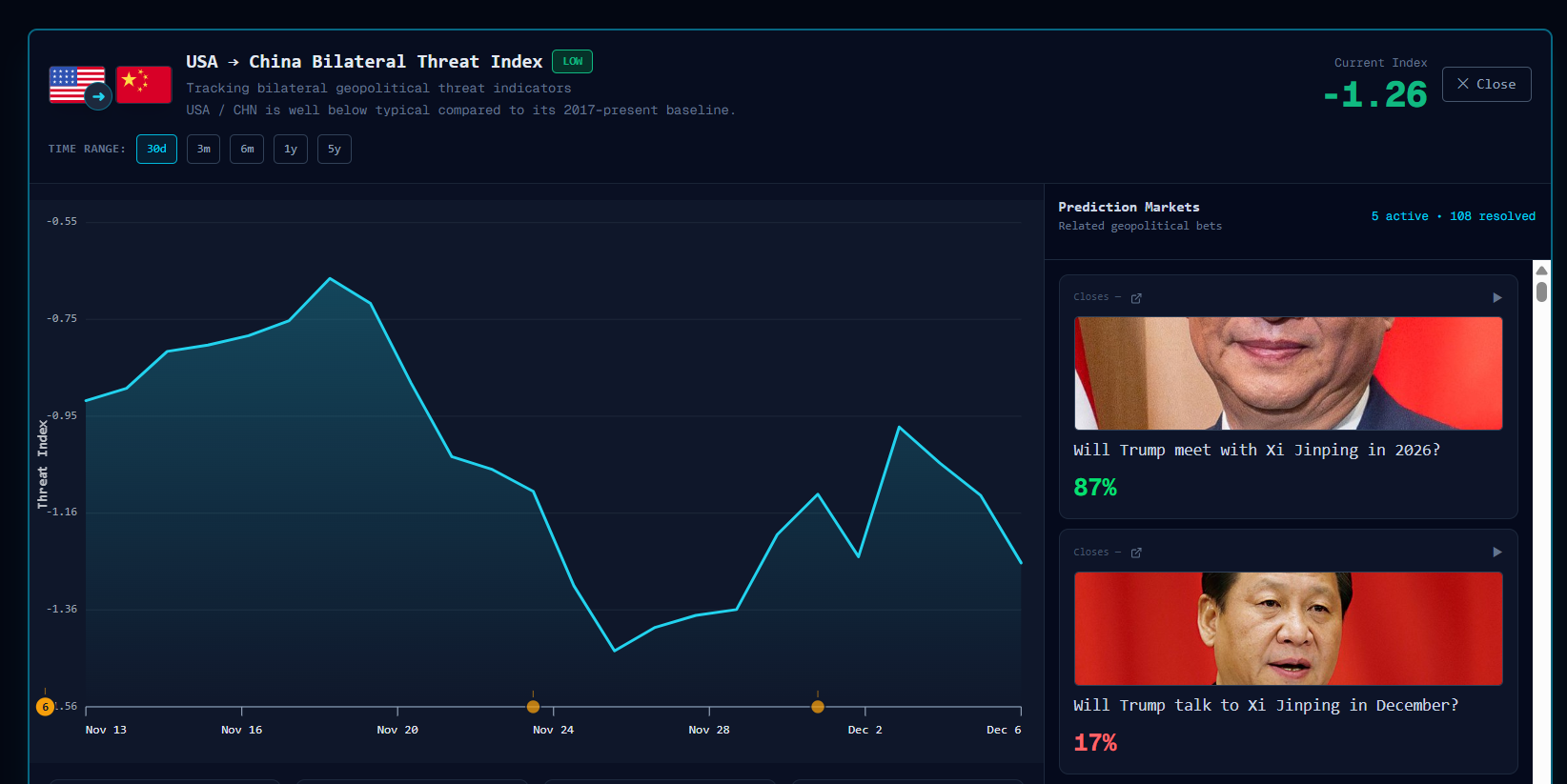 It offers plenty of interactive visualizations per country about the geopolitics, while a trade platform (I do not recommend you to trade), it can be very useful to watch geopolitics in real time: https://www.pizzint.watch/polyglobe