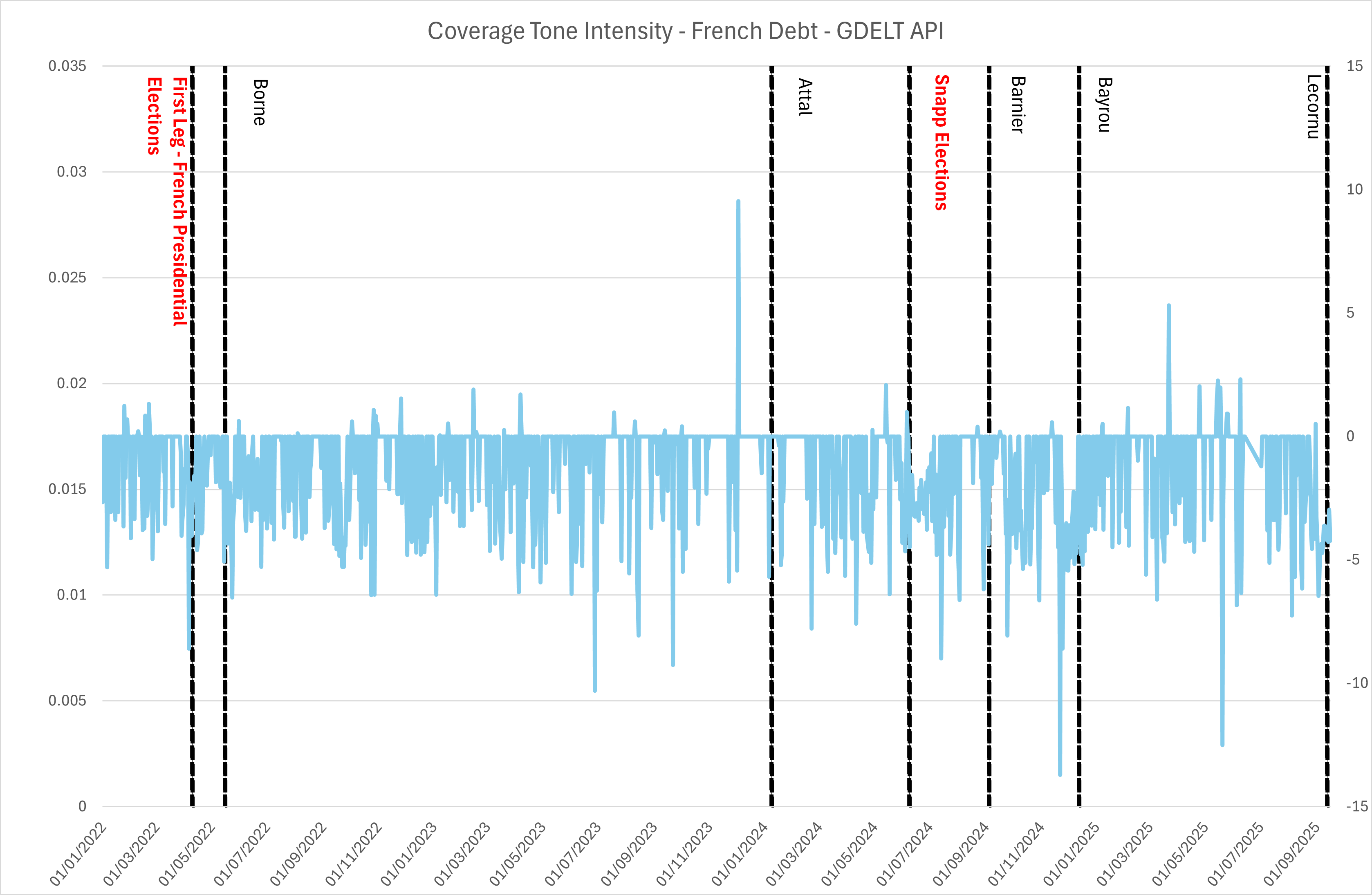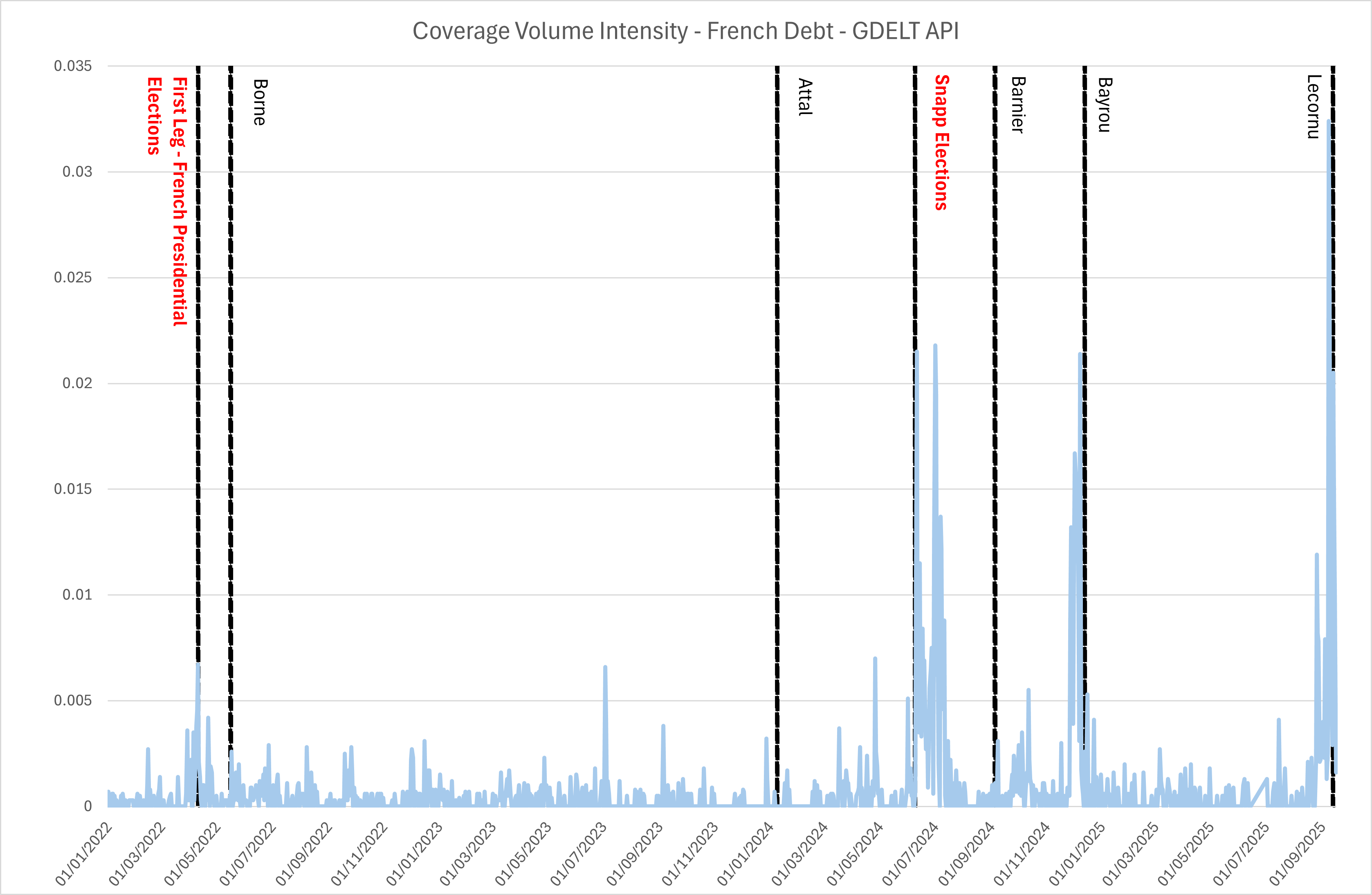 The figure above, built with the GDELT API, tracks media coverage intensity related to French debt since 2022. Coverage volume is a useful proxy for stress and attention in financial markets: when headlines spike, it usually reflects heightened investor concern about sovereign sustainability, fiscal credibility, or broader political uncertainty.