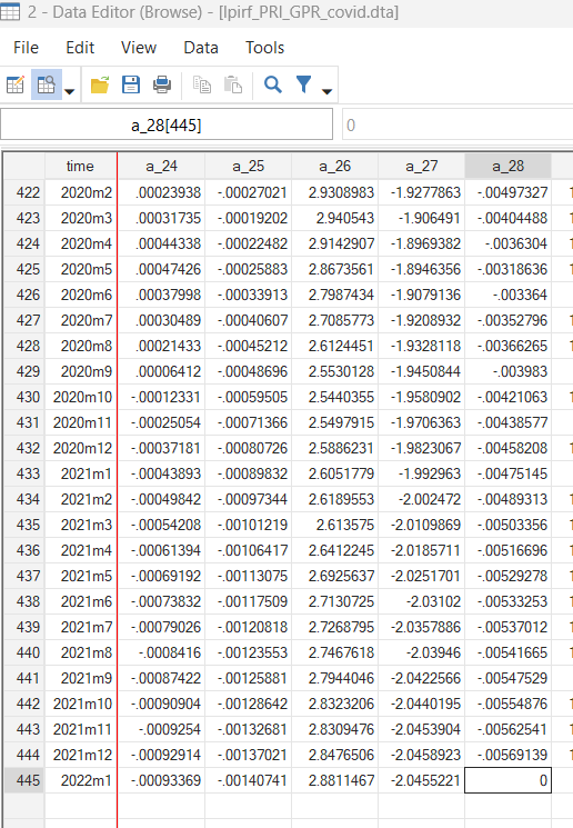 As I am interested in the impact of the identified shock of geopolitical risk (e1) on the real price of oil in log (lrpo), I will select the first line of the matrix e(beta) at each horizon, so the loop will have the following number list: 1(27)1297. To obtain 1297, took the size of the matrix e(beta) and remove the number of time-varying parameters minus one (1323-(27-1)).