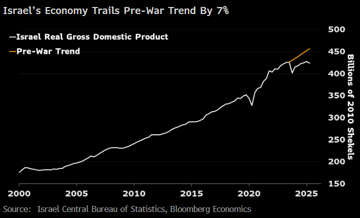 In Israel’s case, the gap relative to the pre-war trend is not merely a cyclical deviation. It represents a deeper scar on the economy’s long-term growth path.